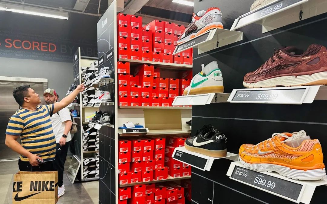 △近日,位于美国加利福尼亚州洛杉矶的一家耐克折扣店里,顾客正在选购运动鞋。